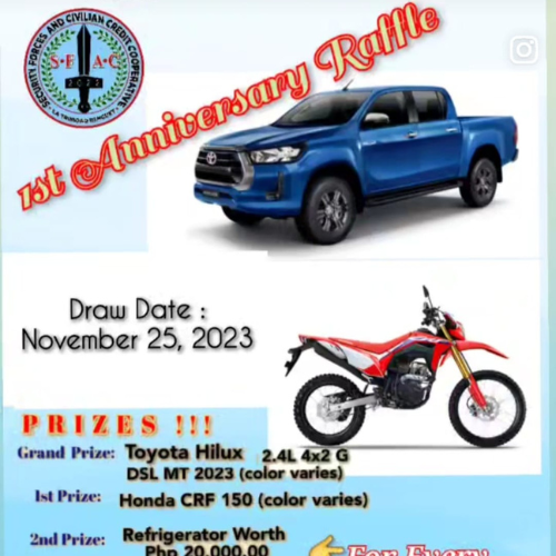 December 10, 2023Have a chance to win Toyota Hilux 2.4L 4x2 G, Honda CRF 150, Refrigerator,Washing Machine, TV and More prizes for every PHP 20,000.00 Time Deposit or Share Capital